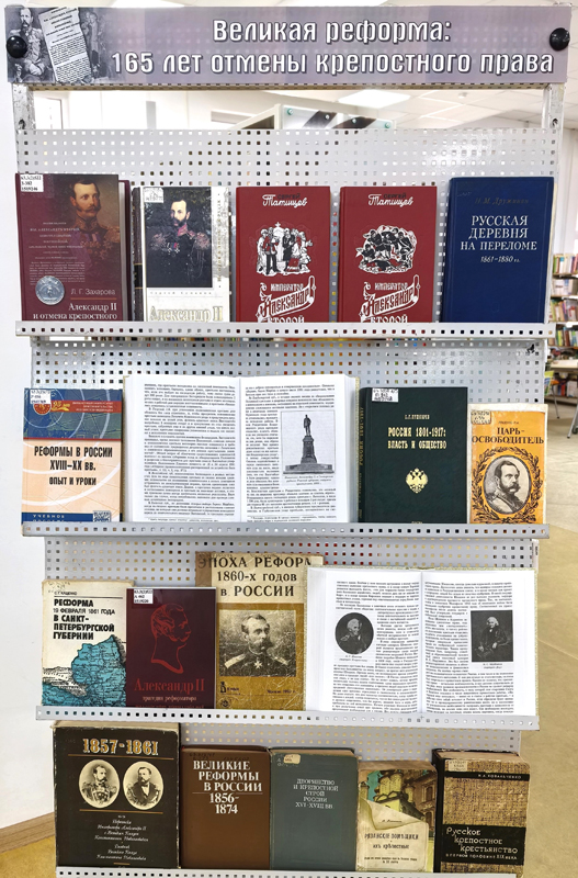 В представленных на выставке изданиях показана личная роль Александра II и его участие на всех этапах создания данного законодательства, а также деятельность людей, готовивших реформу: Н.А. Милютина, Я.И. Ростовцева и других. Читатели смогут узнать о влиянии крестьянской реформы 1861 года на все преобразования 1860–1870-х годов, которые стали именоваться в истории эпохой Великих реформ.