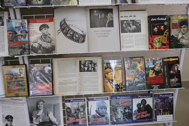 На выставке «Кинематограф о Великой Отечественной…» представлены видеокассеты и диски, рассказывающие о подвиге советского народа на фронте и в тылу. «Летят журавли», «Горячий снег», «Баллада о солдате», «Иваново детство», «Звезда», «Торпедоносцы», «Освобождение» - это неполный перечень фильмов, которые позволят окунуться в ту страшную эпоху
