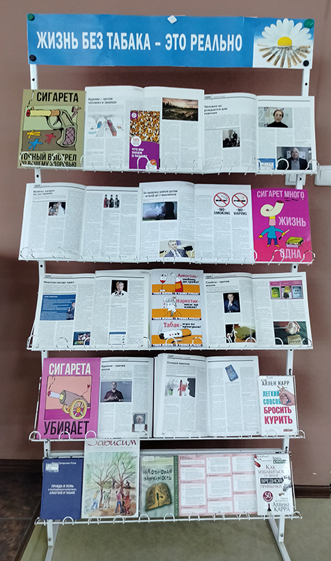 Курение давно превратилось в глобальную эпидемию, уносящую ежегодно миллионы жизней. Журналы и книги, представленные на выставке, знакомят посетителей библиотеки с влиянием табакокурения на организм человека. Популярные монографии и журнальные статьи дают информацию о вреде табака и предлагают программу преодоления никотиновой зависимости.