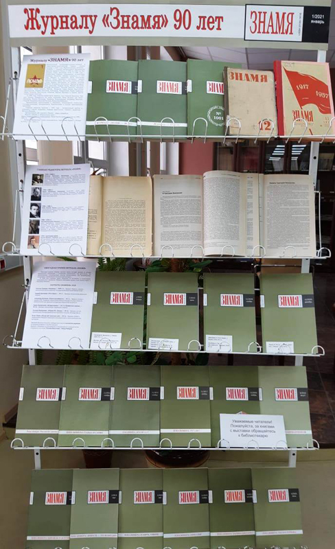 В нашей библиотеке можно ознакомиться с выпусками журнала «Знамя» за 1935, 1957 – 2021 гг. Многие из них представлены на выставке в зале периодических изданий.