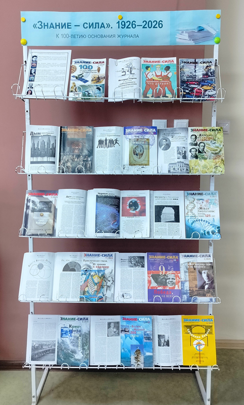 На выставке в зале периодических изданий представлены выпуски журнала «Знание-сила» с 2004 по 2026 год.