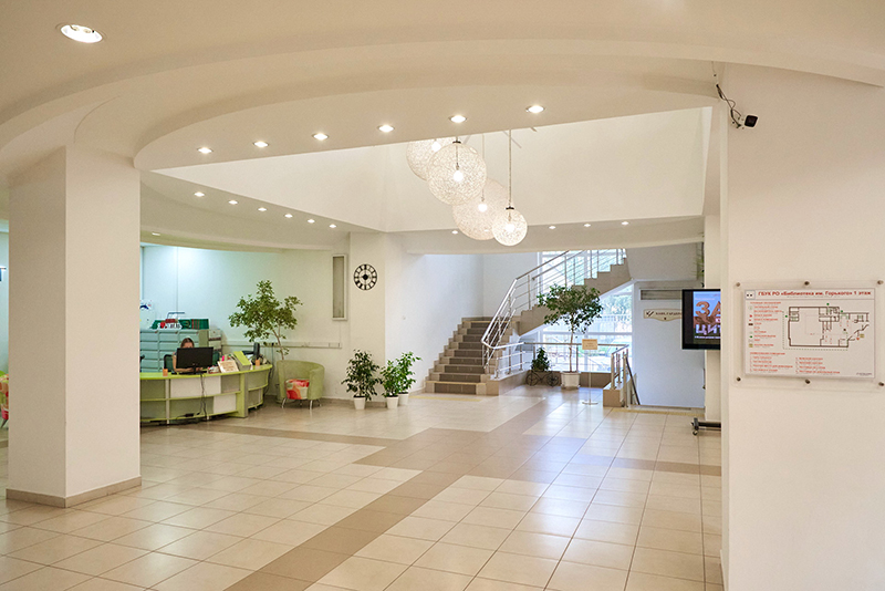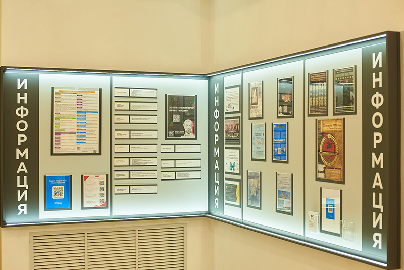 При входе в библиотеку на информационном стенде и плазменной панеле представлена афиша событий, происходящих в библиотеке, а также электронный информационный киоск, который поможет ориентироваться в библиотеке и быть в курсе ее новостей.
