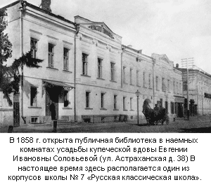 2. Библиотека Рязанского общественного всесословного собрания в доме Каледо и Мыльниковой помещалась на ул. Астраханской (современный адрес ул. Ленина д. 28). Эта библиотека была расчитана на именитое купечество, крупных чиновников – членов клуба всесословного собрания.