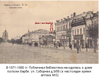 Комитетом создаются комфортные условия для читателей. В то время библиотека находилась в доме госпожи Барбе на углу Семинарской и Соборной улиц. В квартире, где она размещалась, были перемощены полы, выкрашены и обиты комнаты обоями, пробита дверь в одну из комнат квартиры библиотекаря, которая потом и была прибавлена под помещение библиотеки». (Отчет Рязанской Публичной библиотеки за 1873 год. — Рязань, Тип. губ. правл., 1874. — С.6).