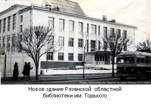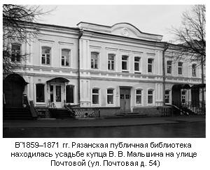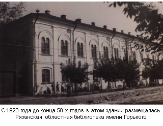 1. Библиотека Рязанского благородного собрания помещалась в Доме Дворянства на ул. Почтовой. Эта библиотека была доступна очень не большому кругу читателей.