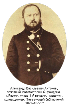 Александр Васильевич Антонов (1825–1892) — почетный потомственный гражданин г. Рязани, купец 1-й гильдии, баснописец, коллекционер рязанской старины жертвовал деньги и дарил книги.