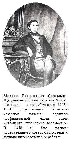 Интересовался работой библиотеки, был членом ее попечительного совета Михаил Евграфович Салтыков-Щедрин (1826–1889). Он пожертвовал библиотеке 10 рублей и журналы «Искра» и «Московский вестник» за 1858 г. Редакция газеты «Рязанские губернские ведомости» бесплатно передавала в фонд библиотеки свою газету и другие периодические издания, поступавшие в обмен на губернские ведомости.