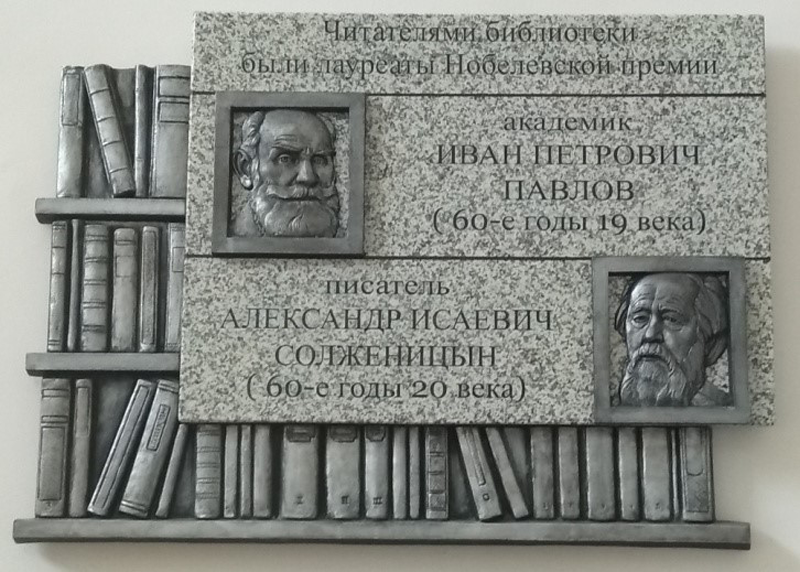 Открыта мемориальная доска в честь лауреатов Нобелевской премии Ивана Петровича Павлова и Александра Исаевича Солженицына, которые в разное время были читателями библиотеки. Автор работы Василий Горбунов.