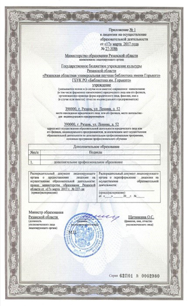 17 марта Рязанской областной универсальной научной библиотекой им. Горького получена лицензия на осуществление образовательной деятельности по программам дополнительного профессионального образования № 27-3086.