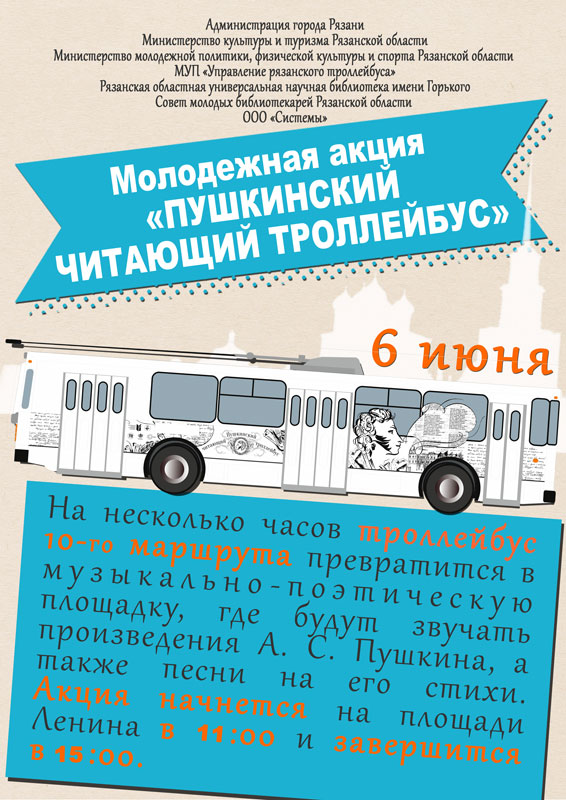 В Пушкинский день России и в День русского языка, 6 июня, Рязанская областная универсальная научная библиотека им. Горького и областной Совет молодых библиотекарей проводят молодежную акцию «Пушкинский читающий троллейбус».