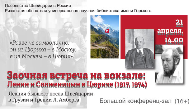 21 апреля в 14.00 в Рязанской областной универсальной научной библиотеке имени Горького состоится лекция Лоренцо Амберга (Швейцария) «Разве не символично: он из Цюриха – в Москву, я из Москвы – в Цюрих». Заочная встреча на вокзале: Ленин и Солженицын в Цюрихе (1917, 1974). Лекция проводится в рамках проекта «Реформы и революции: Европа и Россия», который осуществляет посольство Швейцарии совместно с рядом российских учреждений.