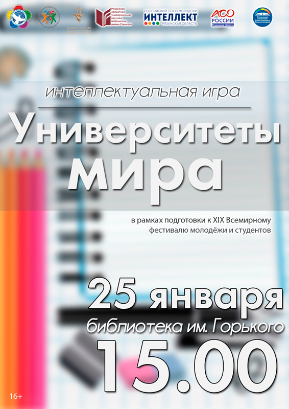 Большой конференц-залПриглашаем студентов вузов и молодежь области принять участие в интеллектуальной игре «Университеты мира» (в формате спортивного «Что? Где? Когда?») в рамках подготовки в XIX Всемирному фестивалю молодежи и студентов.