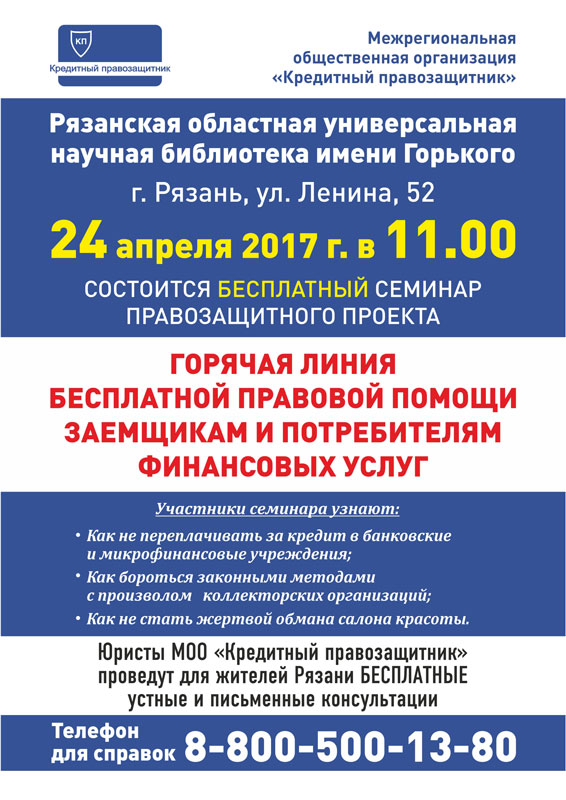 Приглашаем принять участие в мероприятии, на котором кроме общей презентации и освещения тенденций развития и взаимодействия с органами власти будут также представлены «кейсы» конкретных нарушений и проблем заемщиков, а также состоится открытая консультация для жителей г. Рязань.