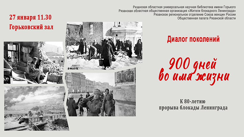 27 января в 11:30 в Рязанской областной универсальной научной библиотеке имени Горького состоится памятное мероприятие «900 дней во имя жизни», посвященное 80-й годовщине прорыва блокады Ленинграда.
