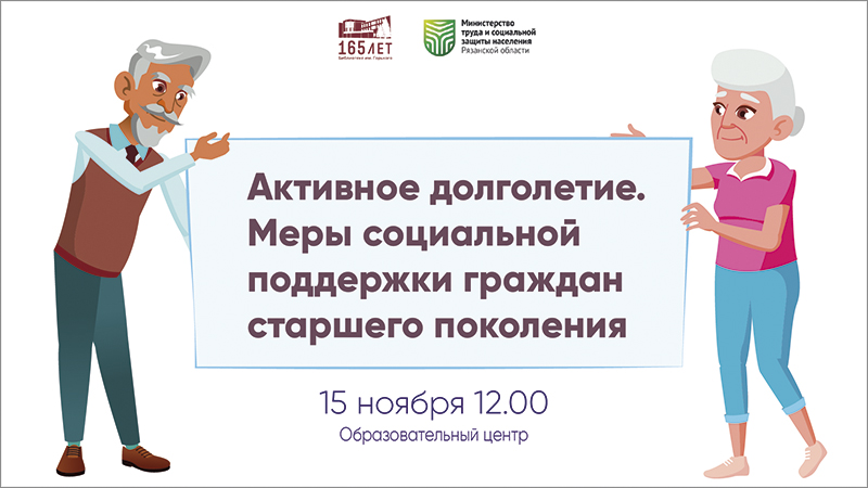 15 ноября в рамках проекта «Чтоб чувствовать жизнь: лаборатория цифрового совершенствования» Рязанской региональной Общественной организации по поддержке семьи и сохранению культурных ценностей «Равновесие» состоится консультация специалистов Рязанского министерства труда и соцзащиты на тему: «Активное долголетие. Меры социальной поддержки граждан старшего поколения».