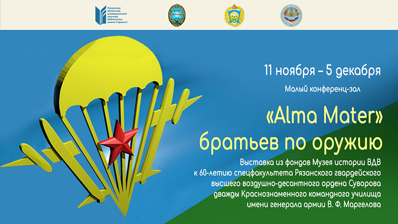 С 11 ноября по 5 декабря в малом конференц-зале библиотеки имени Горького будет работать выставка из фондов Музея истории ВДВ, посвященная 60-летию специального факультета Рязанского гвардейского высшего воздушно-десантного ордена Суворова дважды Краснознаменного командного училища имени генерала армии В.Ф. Маргелова.