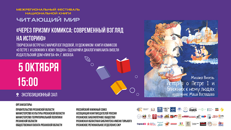 На Межрегиональном фестивале национальной книги «Читающий мир» состоится творческая встреча с Марией Взглядовой, художником книги комиксов «О Петре I и ближних к нему людях», вышедшей в издательском доме «Лингва-Ф» (г. Москва). Сценаристом и автором диалогов книги выступил писатель Михаил Визель.