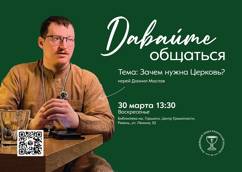 Центр грамотности30 марта в 13:30 в центре грамотности Рязанской областной универсальной научной библиотеки имени Горького состоится очередная встреча в рамках проекта «Давайте общаться!» молодежного отдела Рязанской епархии.