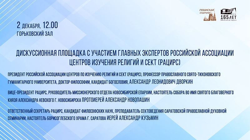 Горьковский зал2 декабря в Горьковском зале Рязанской областной библиотеки состоится дискуссионная площадка с участием главных экспертов Российской ассоциации центров изучения религий и сект (РАЦИРС).