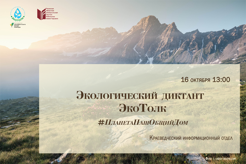 16 октября в 13:00 приглашаем всех желающих в Рязанскую универсальную научную библиотеку имени Горького принять участие в уникальной просветительской акции – Международном эколого-космическом диктанте «ЭкоТолк». Тема этого года: #ПланетаНашОбщийДом.