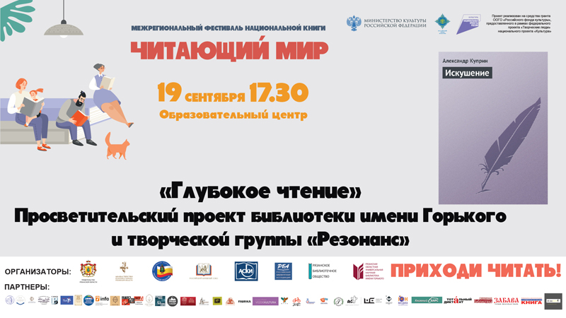 В рамках Межрегионального фестиваля национальной книги «Читающий мир» состоится заседание книголюбов совместного просветительского проекта библиотеки имени Горького и творческой группы «Резонанс» «Глубокое чтение».