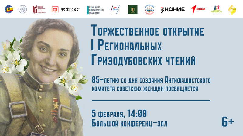 5 февраля в Рязанской областной универсальной научной библиотеке имени Горького состоится торжественное открытие I Региональных Гризодубовских чтений. Событие приурочено к 85-летию со дня создания Антифашистского комитета советских женщин. На мероприятии будет дан старт масштабному социально-просветительскому проекту «Гризодубовские чтения» в Рязанской области.