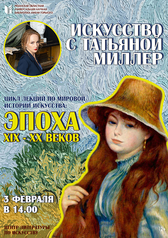 3 февраля в библиотеке продолжится курс лекций для всех, кто любит искусство и хочет научиться в нем разбираться. Педагог и искусствовед Татьяна Миллер (Москва) на очередном занятии расскажет об основных этапах развития искусства XIX и XX веков.