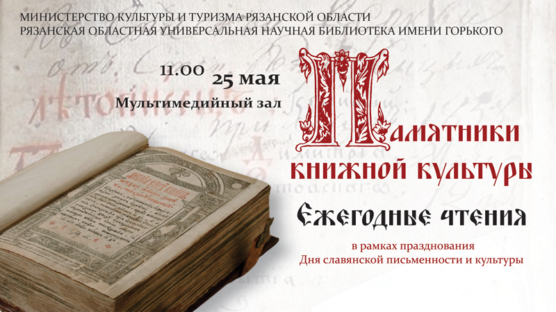 25 мая 2021 года в Рязанской областной универсальной научной библиотеке имени Горького состоятся IX Ежегодные чтения «Памятники книжной культуры».