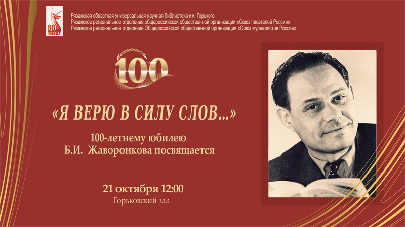 21 октября в библиотеке состоится юбилейное мероприятие, посвященное 100-летию со дня рождения Бориса Ивановича Жаворонкова, нашего земляка, члена Союза писателей России, члена Союза журналистов России, заслуженного работника культуры РФ, почетного гражданина города Рязани.