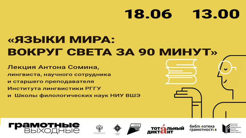 В рамках фестиваля русского языка состоится лекция «Языки мира: вокруг света за 90 минут» Антона Сомина, лингвиста, научного сотрудника и старшего преподавателя Института лингвистики РГГУ и Школы филологических наук НИУ ВШЭ, тренера сборной России на Международной олимпиаде школьников по лингвистике. Антон Сомин - один из авторов книги «Сто языков: вселенная слов и смыслов».