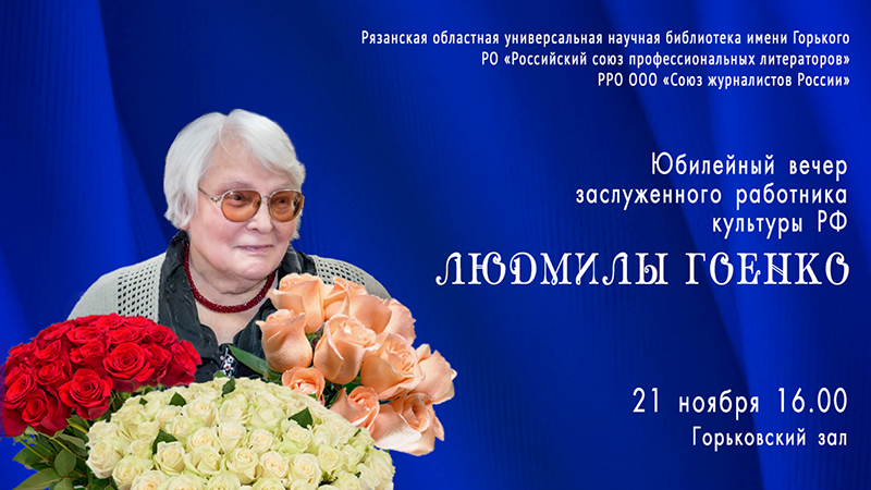 Юбилейный вечер Людмилы Гоенко состоится в 16:00 в Горьковском зале библиотеки. Поздравить Людмилу Георгиевну придут коллеги, друзья, ученики, почитатели творчества.