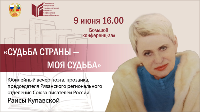 9 июня в библиотеке состоится юбилейный вечер поэта и прозаика Раисы Николаевны Купавской, члена Союза писателей России с 1995 года, председателя Правления Рязанского регионального отделения Общероссийской общественной организации «Союз писателей России», ответственного секретаря Союза писателей России.