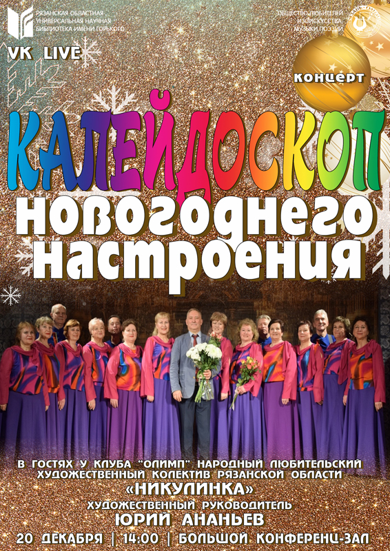 В преддверии новогодних праздников в клубе «ОЛИМП» состоится концерт народного художественного коллектива Рязанской области песенного ансамбля «Никулинка» «Калейдоскоп новогоднего настроения», художественный руководитель – заслуженный работник культуры России, композитор Юрий Васильевич Ананьев. Коллектив – лауреат Всероссийских и межрегиональных фестивалей и смотров любительского творчества.
