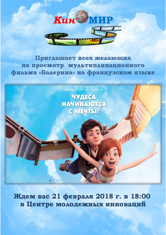 Киноклуб «КиноМИР» приглашает всех любителей французского языка 21 февраля на просмотр французско-канадского мультипликационного фильма «Балерина» режиссера Эрика Саммера.