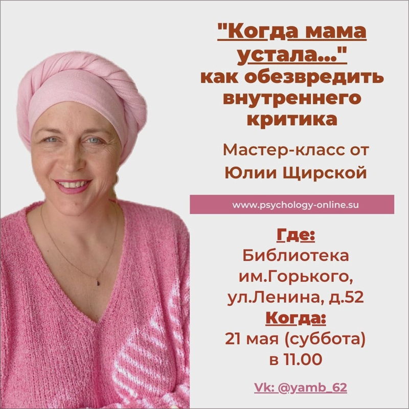 21 мая в библиотеке им. Горького пройдет мастер-класс «Когда мама устала…Как обезвредить внутреннего критика» в рамках проекта лекторий для мам «Я-Малыш-Баланс_62».