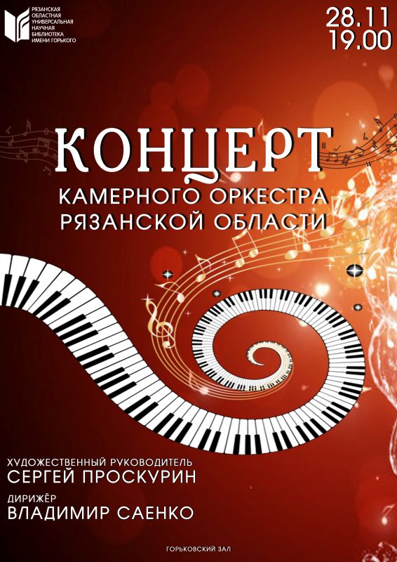 28 ноября в Рязанской областной библиотеке имени Горького состоится концерт Камерного оркестра Рязанской области (дирижер - Владимир Саенко, художественный руководитель - Сергей Проскурин).
