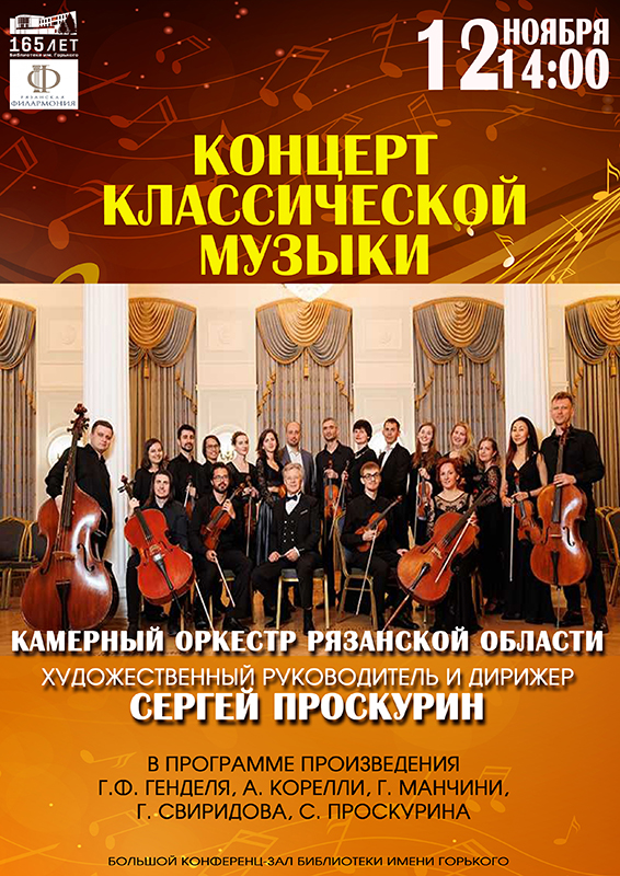 12 ноября в клубе «ОЛИМП» состоится «Концерт классической музыки» Камерного оркестра Рязанской области под управлением Сергея Проскурина.