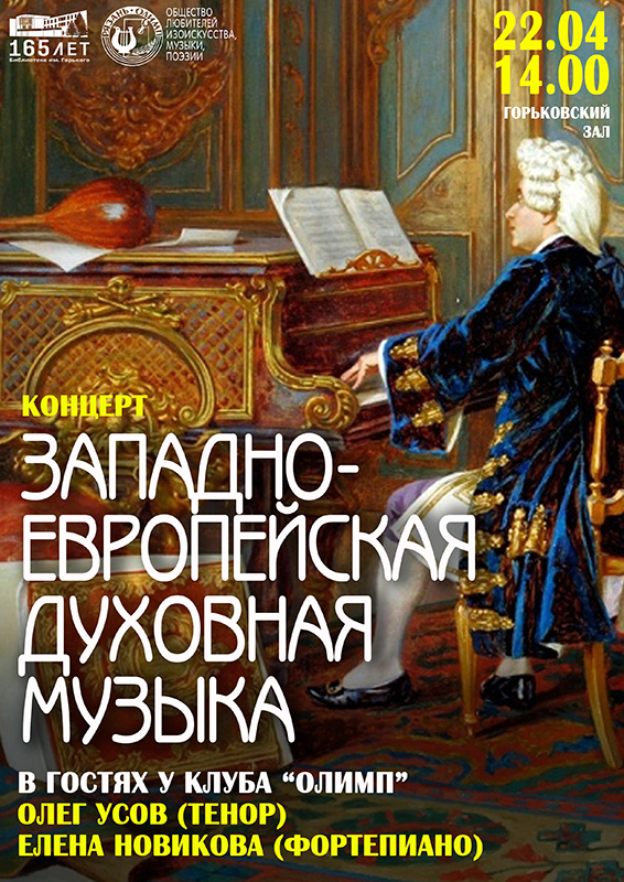 22 апреля в клубе «ОЛИМП» состоится концерт «Западноевропейская духовная вокальная музыка» лауреата международных конкурсов Олега Усова (тенор), партию фортепиано исполнит лауреат международных конкурсов Елена Новикова (город Луховицы Московской области). В программу вошли мировые шедевры духовной вокальной музыки разных эпох, стилей, жанров.