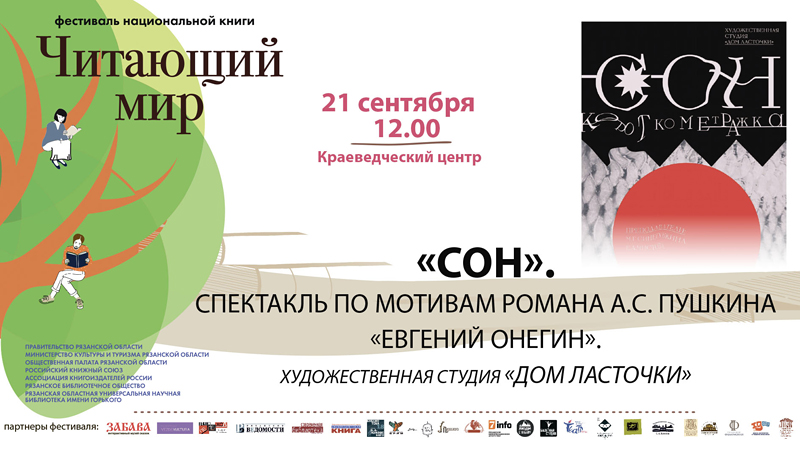 Сумеет ли убежать Татьяна Ларина от косматого лакея и перебраться через кипучий седой поток? Что и кто снились Тане, покажет художественная студия «Дом ласточки» в короткометражном представлении для взрослых и детей «Сон» по мотивам романа А.С. Пушкина «Евгений Онегин».