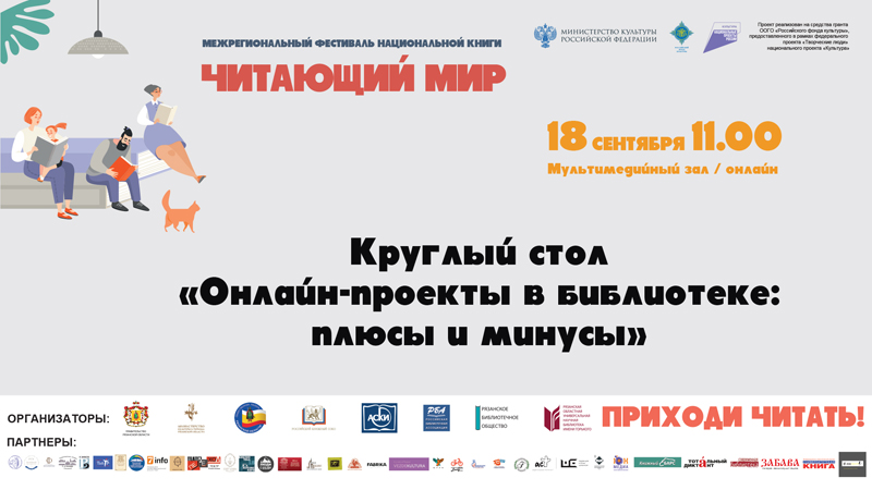 В рамках Межрегионального фестиваля национальной книги «Читающий мир» состоится круглый стол «Онлайн-проекты в библиотеке: плюсы и минусы». Организаторы мероприятия: Рязанская областная универсальная научная библиотека имени Горького и Всероссийская государственная библиотека иностранной литературы имени М.И. Рудомино.