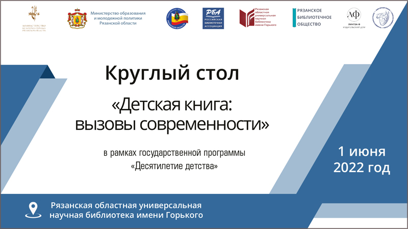 1 июня 2022 года в 12.00 в Рязанской областной универсальной научной библиотеке имени Горького состоится круглый стол на тему «Детская книга: вызовы современности».