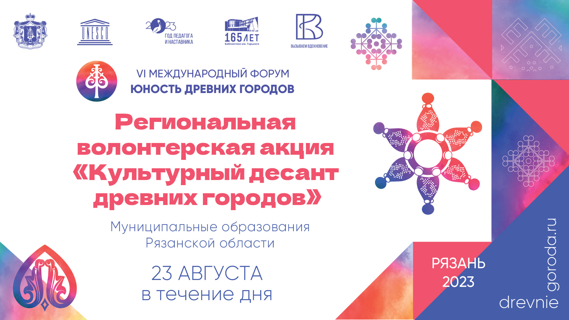 23 августа 2023 года в рамках VI Международного форума древних городов пройдет региональная волонтерская акция «Культурный десант». В акции примут участие волонтеры культуры, сотрудники учреждений культуры и жители муниципальных образований Рязанской области и города Рязани. Цель акции – сохранение и благоустройство объектов культурного наследия Рязанской области на территории муниципальных образований региона.
