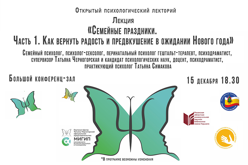 Лекции организованы Гештальт-центром Татьяны Черногорской, официального представителя Московского института Гештальта и Психодрамы в г. Рязани, совместно с Центром социальной психолого-педагогической и медицинской помощи, при поддержке Общественной палаты Рязанской области и Рязанской областной универсальной научной библиотеки имени Горького.