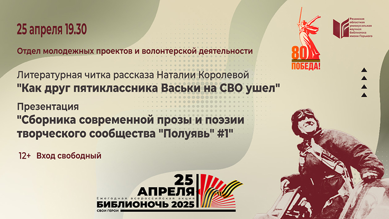 25 апреля в 19:30 в отделе молодежных проектов и волонтерской деятельности в рамках Всероссийской акции «Библионочь-2025» состоится литературная читка рассказа Наталии Королевой «Как друг пятиклассника Васьки на СВО ушел», а также презентация «Сборника современной прозы и поэзии сообщества “Полуявь” #1».