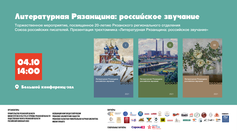 На мероприятии состоится презентация трехтомника «Литературная Рязанщина: российское звучание», изданного к юбилею организации при поддержке министерства культуры и туризма Рязанской области, Рязанского библиотечного общества, Рязанской областной библиотеки им. Горького.