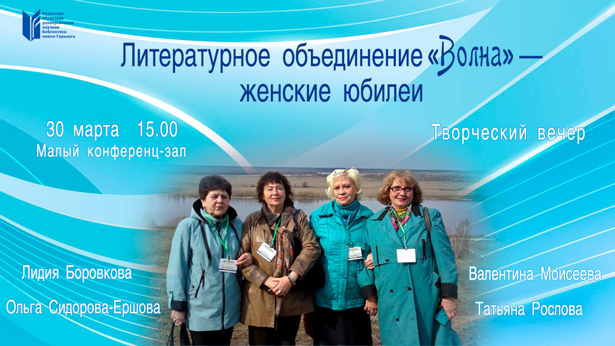 30 марта в библиотеке состоится творческий вечер членов литературного объединения «Волна» Государственного Рязанского приборного завода. Этот творческий коллектив возник более двадцати лет назад, он объединяет людей, увлеченных литературным процессом. «Волновцы», как они сами себя называют, частые гости нашей библиотеки. Они участвуют в наших культурных мероприятиях, проводят в стенах Горьковки творческие встречи.