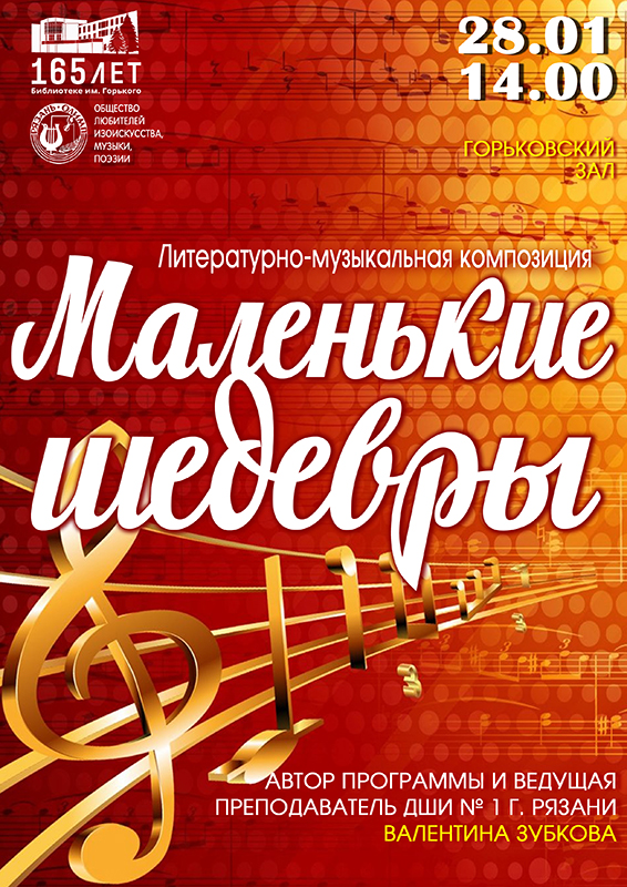 На очередной встрече в клубе «ОЛИМП» состоится показ литературно-музыкальной композиции «Маленькие шедевры». Ее подготовили преподаватели и учащиеся детской школы искусств № 1 города Рязани. Автор и ведущая программы – преподаватель Валентина Яковлевна Зубкова.