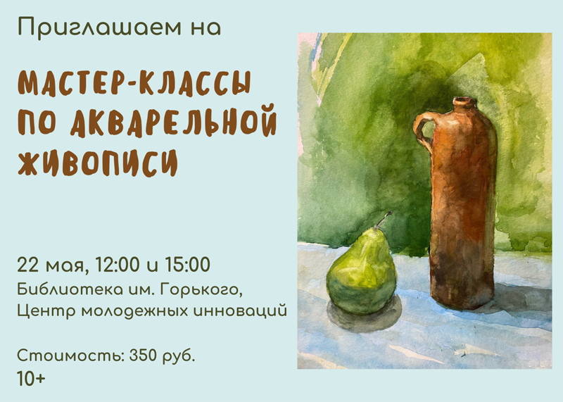 Библиотека имени Горького и творческая мастерская «Шмель» приглашают на мастер-классы по акварельной живописи, которые состоятся 22 мая. Занятия проведет преподаватель студии «Шмель», известный рязанский художник, член Союза художников России Абакумов Сергей Викторович.