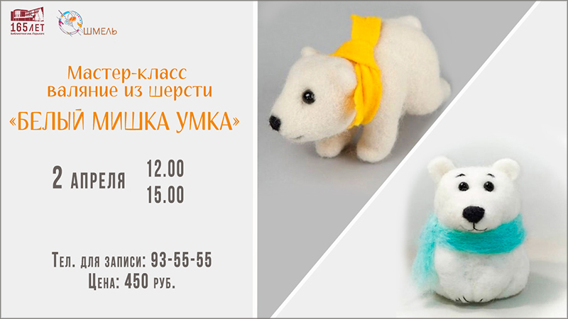 Друзья, ждем вас в это воскресенье на наших мастер-классах по валянию из шерсти. В этот раз вместе с преподавателем студии «Шмель» Юлией Незаленовой мы будем создавать белого мишку Умку.