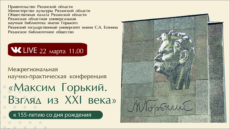 22 марта 2023 г. Рязанская областная универсальная научная библиотека имени Горького проводит Межрегиональную научно-практическую конференцию «Максим Горький. Взгляд из XXI века», приуроченную к 155-летию со дня рождения М. Горького.